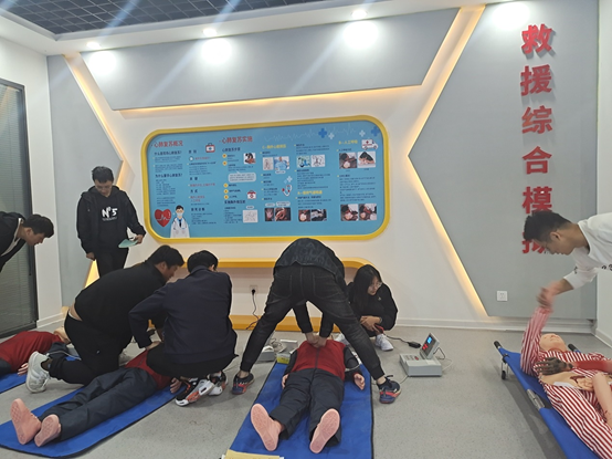 “掌掌重叠,十指交叉,手指外翘、掌跟放在胸骨的位置,用上半身的力量垂直按压……”HSE安全体验馆现场正在进行心肺复苏急救演示。