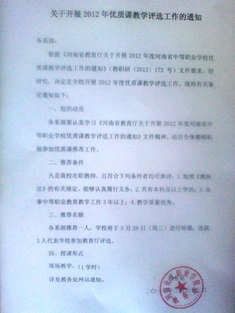 接教务处通知,我院将举行优质课评选活动,具体事项见附件。请有意参加的老师提前做好准备,并在下周一之前告知教学秘书。