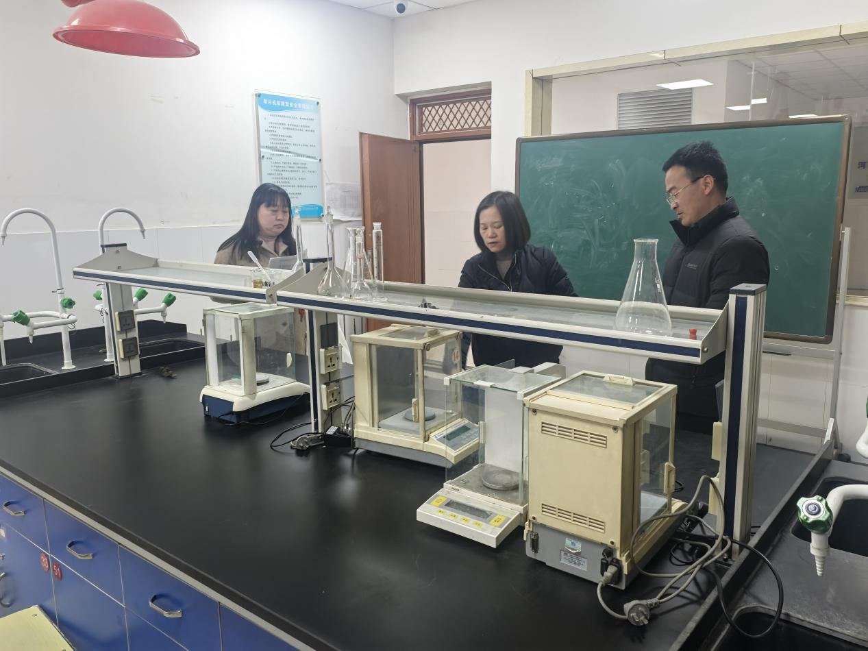 实验室安全是本次检查的重中之重。检查人员走进化工综合实训室、纯水实训室、化学试剂流转中心,危废间等场所,对设备运行状况、危化品储存管理、消防设施配备及水电线路安全进行全方位排查。检查组重点核验了设备维护记录,现场测试通风橱、应急喷淋等安全设施,并强调要严格落实危化品“五双”管理制度,为学生营造安全规范的实验环境。