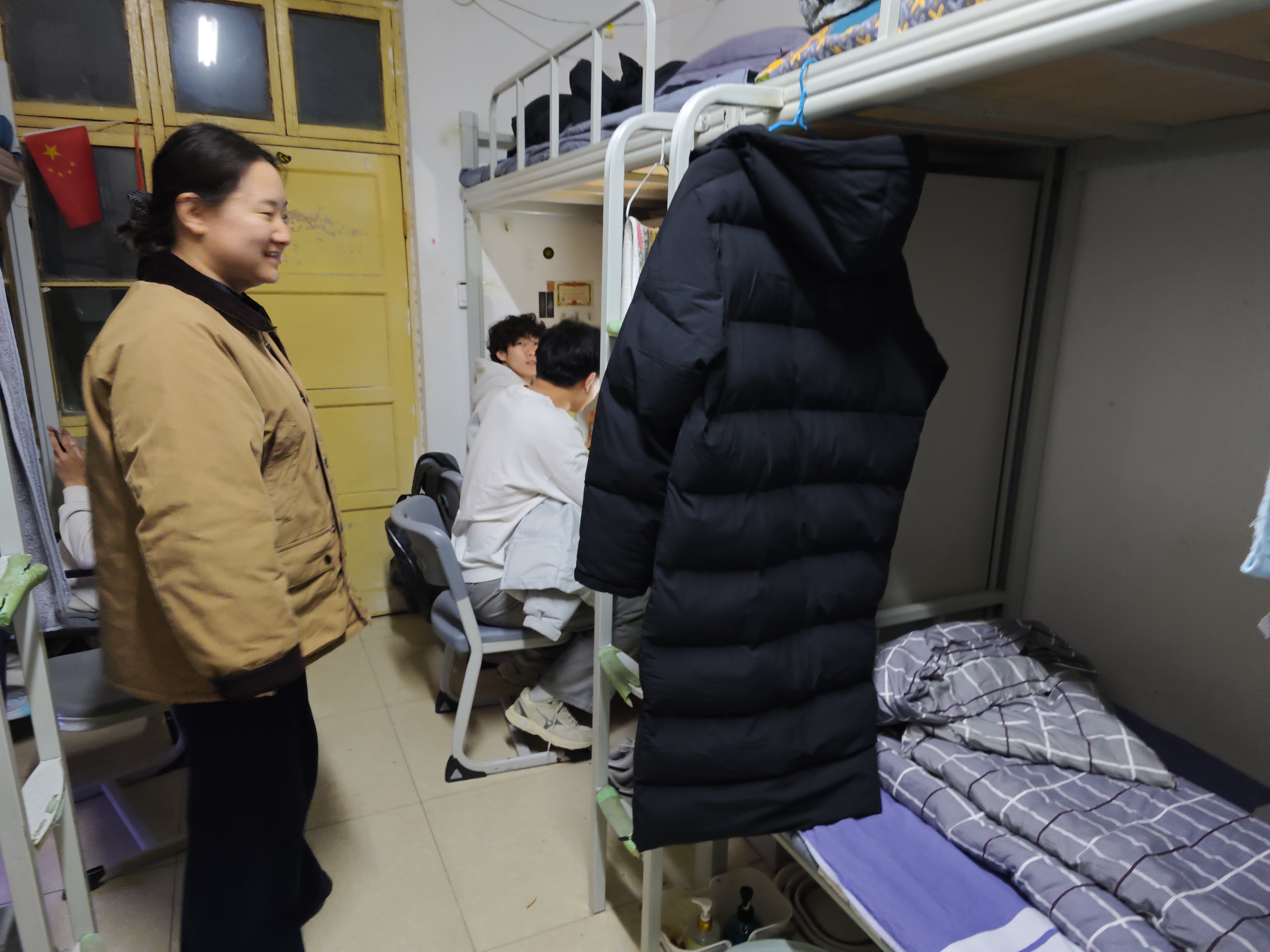 检查过程中,辅导员逐一走访宿舍,围绕用电、消防、卫生等重点环节细致排查,叮嘱同学们注意通风保洁,杜绝安全风险。同时,老师们与返校学生亲切交谈,“假期过得怎么样?”“返校后有没有什么困难?”一句句贴心的问候拉近了师生距离。辅导员们现场解答学生疑问,提醒大家增强安全防范意识,注意防火防盗,调整作息,以饱满状态投入新学期学习。