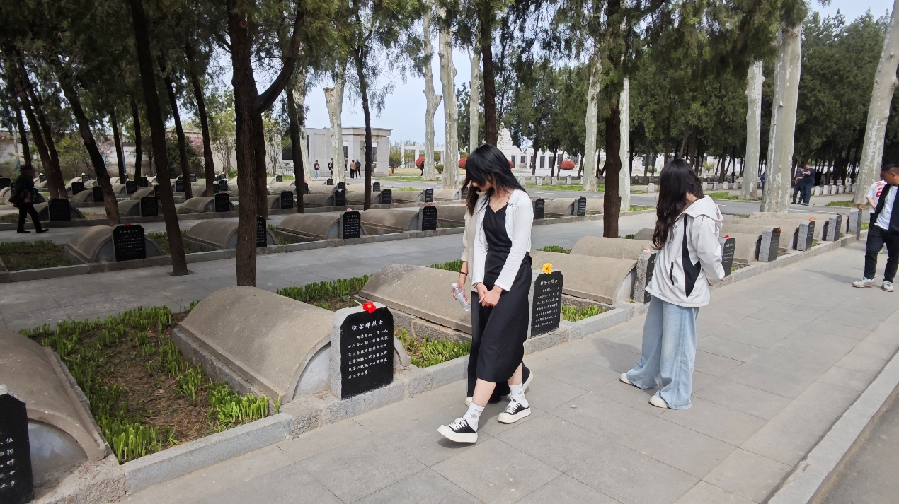 全体学生怀着崇敬之心整齐列队、肃立默哀,向革命先烈致以最崇高的敬意。学生们缓步绕行烈士墓区,敬献白花,默读墓碑。一个个年轻英雄的事迹,学生们惊叹“那么多烈士牺牲时比我们年纪还小!”并由此深刻感悟如今和平幸福生活的来之不易。