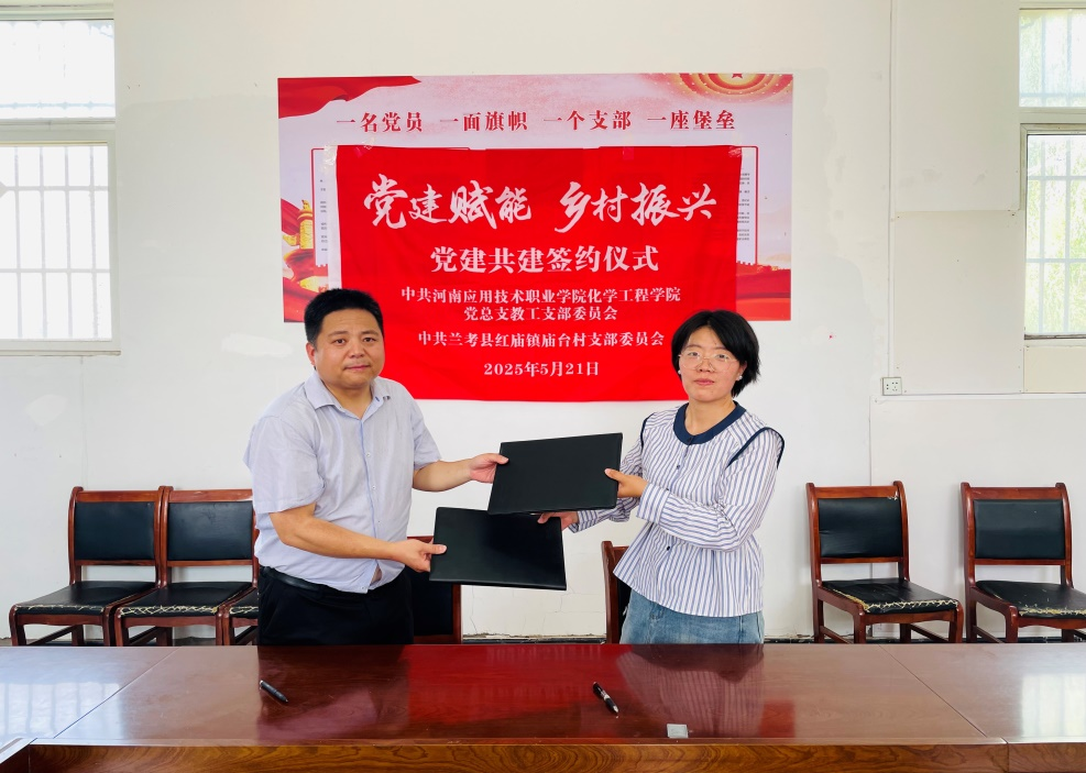活动结束后,中共永利集团化学工程学院党总支教工支部委员会与中共兰考县红庙镇庙台村党支部委员会签订《乡村振兴技术帮扶协议》,推动专业与产业对接、教学过程与生产过程对接,在党建赋能乡村振兴的同时,进一步提升应用化工技术高水平专业群建设。化学工程学院党总支书记陈永惠、党总支副书记常惟诚、副院长岳瑞丰,协管员范雨欣及驻村第一书记任旭凯、队员李盈、陈开友等共同参与签约活动。