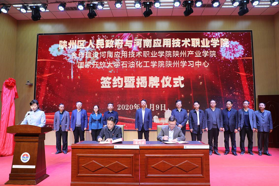 2020年11月9日上午,我校与陕州区人民政府合作建设陕州产业学院、国家开放大学石油化工学院陕州学习中心正式签约揭牌。我院党委书记秦书君,院长范晓伟,副院长陈君丽,陕州区委副书记、区长胡志权,陕州区人大常委会主任吴自力,陕州区政协主席潘新乐,陕州区副区长孙丽松等领导出席签约暨揭牌仪式。化工学院蔡庄红书记以及朱冰院长出席了此次签约暨揭牌仪式。陕州区副区长孙丽松主持仪式。