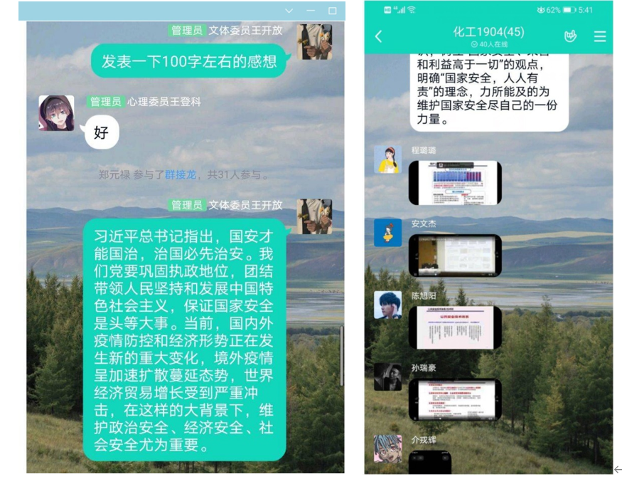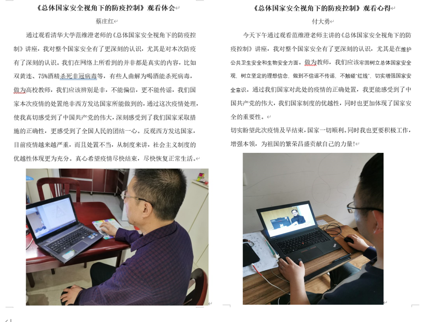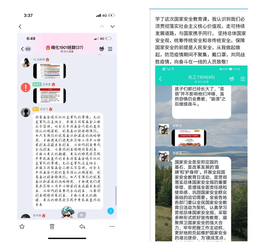 公开课后,化学工程学院全体教师以观后感的形式进行交流和探讨;各班级在线上开展全民国家安全日主题团课,同学们积极参与,踊跃发言,收获良多。他们纷纷表示:这个特殊的时期,千万学生同上一堂国家安全教育课对于我们来说是十分有益的。这节课的主题是总体国家安全观视角下的疫情防控,其实,国家的安全与我们每个人的生活息息相关,人民安全是国家安全的宗旨,人民安全了,祖国才有希望。面对疫情,党中央高度重视,各级国家安全机关围绕中心、服务大局,为维护国家安全和社会大局稳定作出了重要贡献。