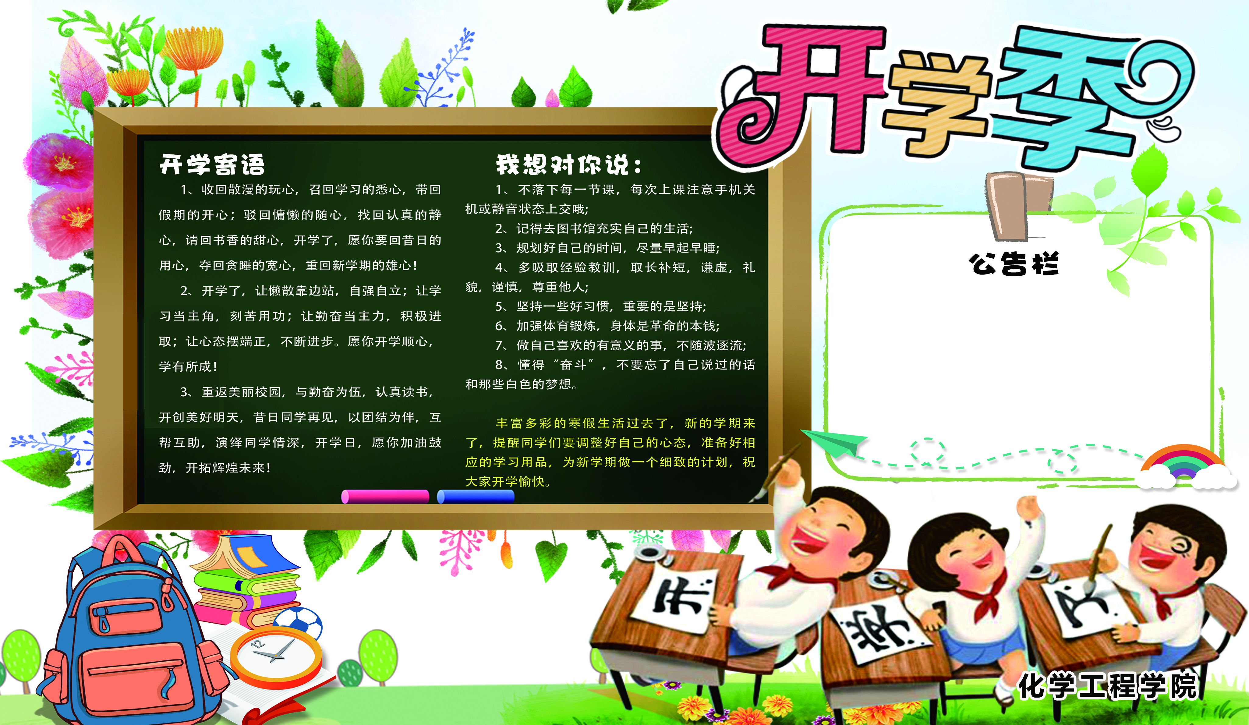 丰富多彩的寒假生活过去了,新的学期来了,开学的钟声响起,上课的铃声响起,唤醒我们年轻的心,抖擞我们青春的劲,开学啦,朋友,祝愿你快乐学习,开心生活! 在这里,提醒同学们要调整好自己的心态,准备好相应的学习用品,为新学年做一个细致的计划,祝大家开学愉快。